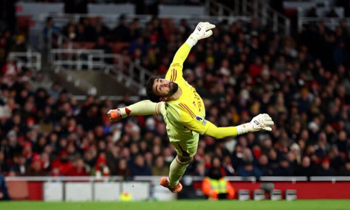 A su manera, entre los vaivenes que atraviesa en los últimos tiempos, mientras recupera por tramos su versión más potente, el conjunto de Mikel Arteta aún padece lapsus, se mueve sobre el alambre en determinados momentos, pero sobrevive en la cumbre, este sábado por la parada decisiva del guardameta internacional español. Fue determinante.