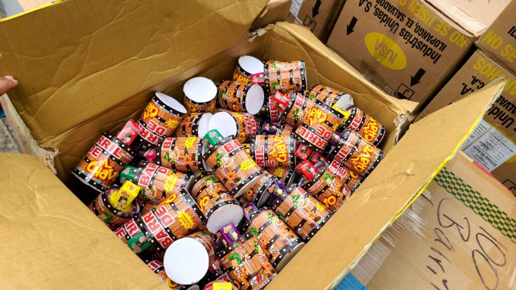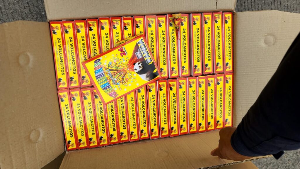 Durante la inspección física se decomisó una importante cantidad de productos no declarados, entre ellos diversas presentaciones de artículos, así como mercancía de polvora variada que incluía 186 metralletas de diferentes tamaños, 1,800 unidades de productos Barrilitos y 7,680 unidades de fósforos.