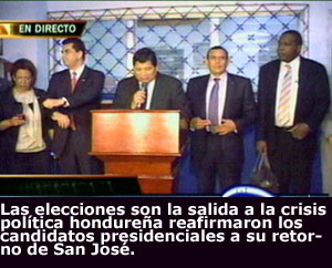 Sobre el planteamiento del retorno del ex presidente Manuel Zelaya como única salida a la crisis, como lo plantea el Acuerdo de San José, los candidatos presidenciales dejaron plantearon que esa no es una situación que “esté en nuestra manos”, en su condición de candidatos presidenciales.