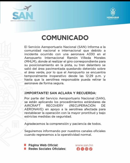 Tegucigalpa – El Servicio Aeroportuario Nacional (SAN), informó que el Aeropuerto Ramón Villeda Morales se encuentra temporalmente inoperativo tras un incidente con una aeronave, misma que quedó varada en el área verde producto de problemas mecánicos.