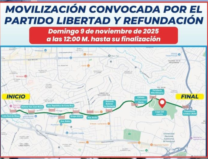 Tegucigalpa – La capital de Honduras, será el lugar donde se vivirá una nueva jornada política este domingo 9 de noviembre debido a la movilización convocada por el Partido Libertad y Refundación (Libre), por lo que, autoridades advierten de las calles que estarán cerradas.