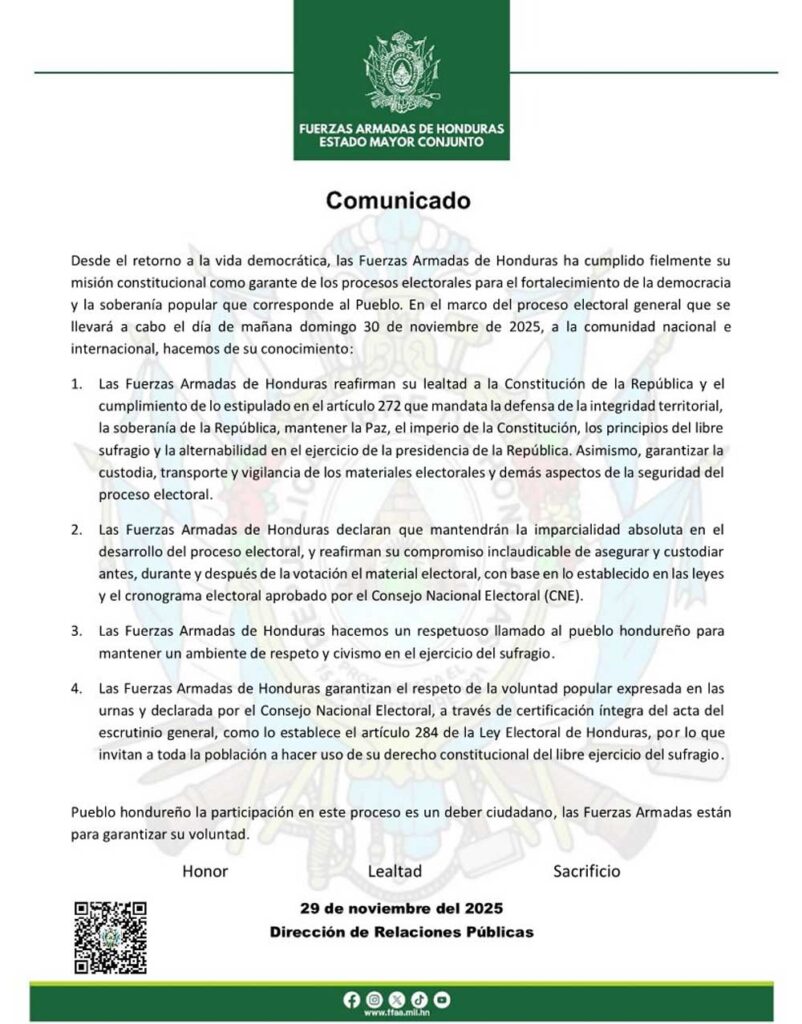 Tegucigalpa – Luego que la Misión de Observación Electoral de la Organización de Estados Americanos (MOE-OEA), pidiera a las Fuerzas Armadas mantener un rol apolítico y no deliberante en las elecciones generales de este domingo, el instituto castrense aseguró que mantendrán “imparcialidad absoluta”, pero con certificación íntegra del acta del escrutinio general.