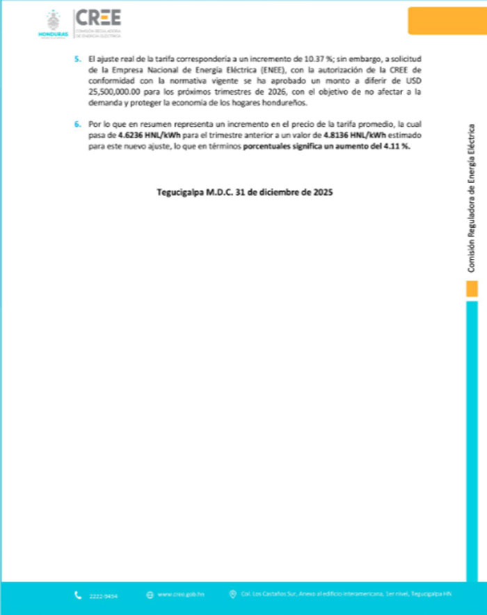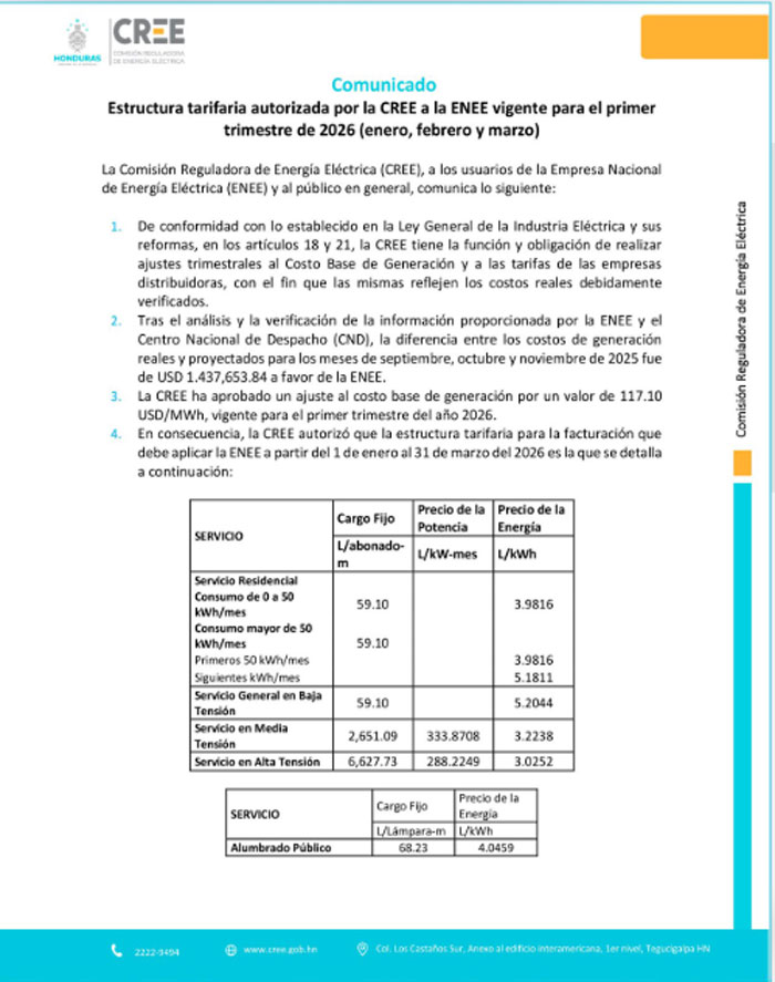 Tegucigalpa – La Comisión Reguladora de la Empresa Nacional de Energía Eléctrica, (ENEE), aprobó un aumento del 4 % a tarifa de la energía eléctrica para los meses de enero, febrero y marzo de 2026.