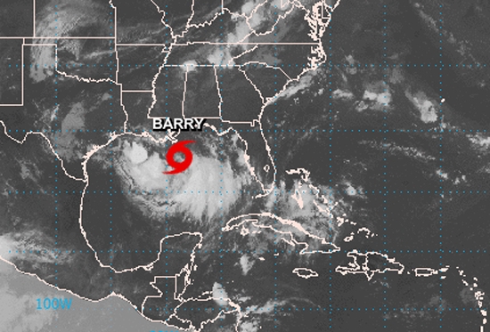Señaló que esta tarde Barry se moverá hacia el noroeste seguido de un giro hacia el norte el sábado, y estará cerca o sobre el centro o sureste de la costa de Luisiana esta noche o el sábado, y luego se moverá tierra adentro sobre el valle del bajo del Misisipi.