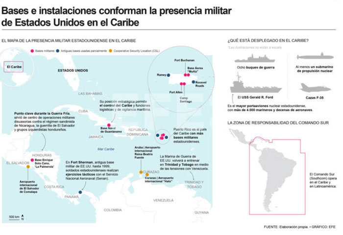Puerto Rico, Honduras y Cuba son los que cuentan con bases militares estadounidenses al uso, aunque la presencia militar de Estados Unidos se extiende a El Salvador, Curazao y Aruba en sus aeropuertos, a Panamá, desde que se retomaron los ejercicios militares, o a Trinidad y Tobago, con la llegada del destructor con misiles USS Gravely.