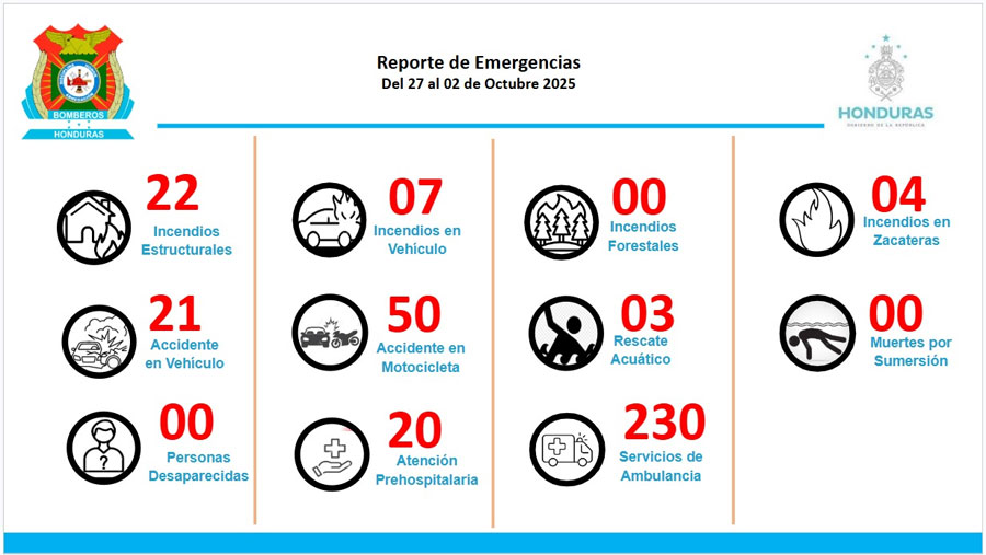 Tegucigalpa – El Cuerpo de Bomberos de Honduras reportó este jueves que desde el 27 de septiembre al 02 de octubre se han registrado 27 incendios estructurales y siete incendios de vehículos.