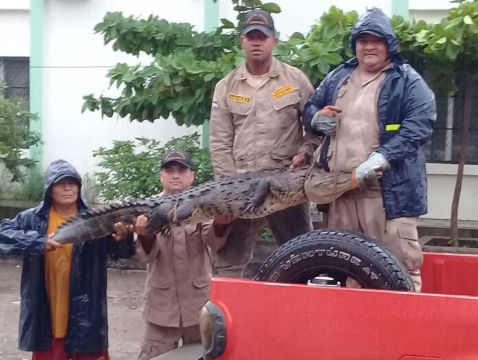 Choluteca – Voluntarios del Cuerpo de Bomberos rescataron este domingo un enorme cocodrilo de dos metros de longitud en la colonia Víctor Argeñal de la ciudad de Choluteca, región sur de Honduras.