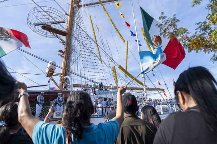 Personas despiden el buque escuela de la Armada Mexicana Cuauhtémoc este sábado, en Nueva York (EEUU). EFE/Ángel Colmenares