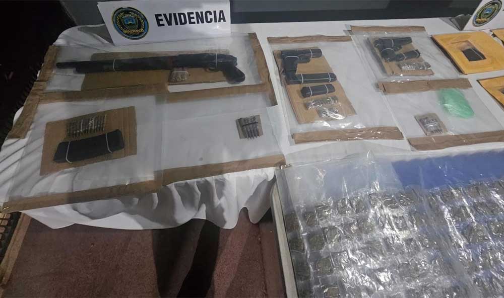 El allanamiento no solo permitió la captura de los delincuentes, sino también la incautación de un significativo arsenal de guerra y un considerable cargamento de narcóticos. Se decomisó un arma de fuego tipo escopeta, pistolas calibre 9mm y 40mm, así como un cargador de metal conteniendo siete cartuchos calibre 40mm y 25 cartuchos supuestamente calibre 5.56mm (munición de fusil de asalto).