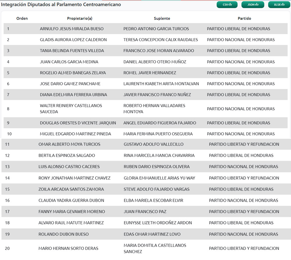 Nombres como Gladys Aurora López (PN), Juan Carlos García (PN), José Darío Gámez (PN), Miguel Martínez (PN), Rony Martínez (Libre), Rolando Dubón Bueso (PN) y Mario Sorto (Libre), están saliendo como representantes de Honduras.