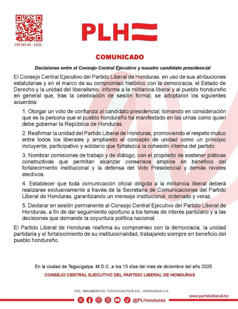 Otro punto clave del pronunciamiento es que toda comunicación dirigida a la militancia liberal deberá canalizarse exclusivamente a través de la Secretaría de Comunicaciones del PLH. Con ello, el partido busca garantizar un mensaje institucional unificado, coherente y verificable, reduciendo vocerías paralelas y versiones contradictorias en medio de la crisis política.