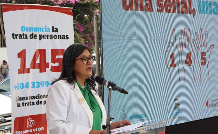 Tegucigalpa.– La Comisión Interinstitucional contra la Explotación Sexual Comercial y Trata de Personas (CICESCT), en alianza con Abogados sin Fronteras Canadá (ASF Canadá), presentó este lunes la campaña de comunicaciones “Una señal, una vida” destinada a sensibilizar a la población sobre la trata de personas y a dar a conocer los canales disponibles para denunciar este delito: la línea 145 y el número de WhatsApp +504 3399-4699, así como la señal de ayuda contra la Trata de Personas.