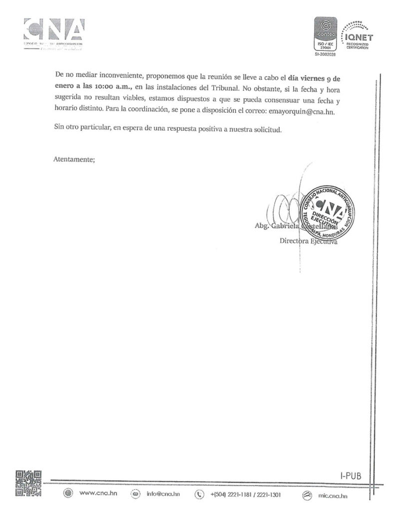 Tegucigalpa – El Consejo Nacional Anticorrupción (CNA) solicitó mediante un documento formal una reunión con el Tribunal de Justicia Electoral (TJE), con el objetivo de conocer el estado actual de los recursos interpuestos y las dificultades que enfrenta dicho órgano en el ejercicio de sus atribuciones constitucionales.