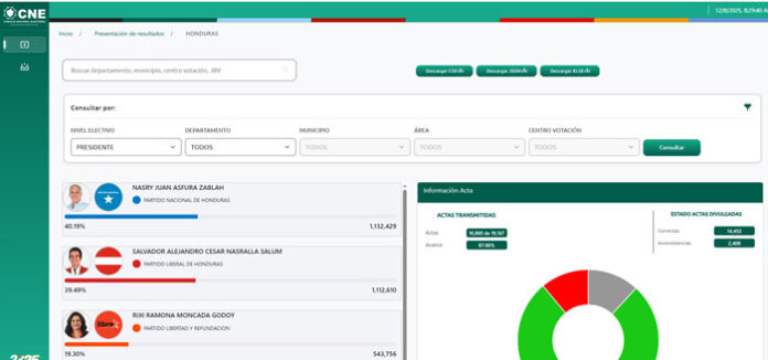 El conteo preliminar tras escrutar el 88.87 % de las actas, mantiene a Asfura al frente con 1.143.862 votos (40,20 %), una ventaja estrecha sobre Salvador Nasralla, candidato del también conservador Partido Liberal, que suma 1.124.132 sufragios (39,50 %).