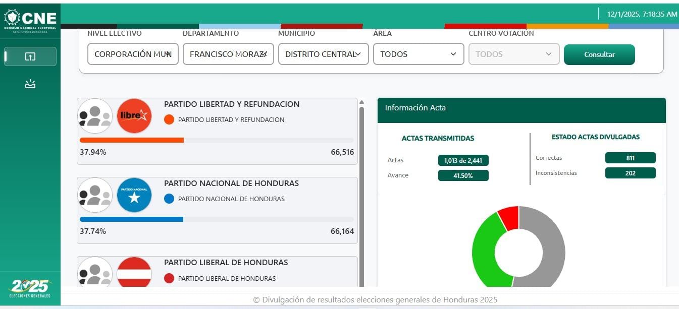 La contienda en la comuna capitalina sigue marcada por una fuerte disputa entre el candidato oficialista Aldana y el nacionalista Zelaya, cuya diferencia es de apenas 352 votos, lo que convierte la elección del Distrito Central en una de las más competidas del país.