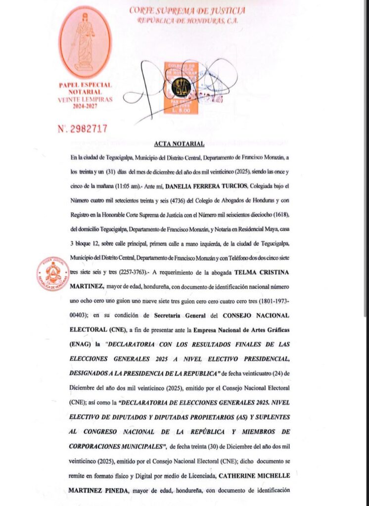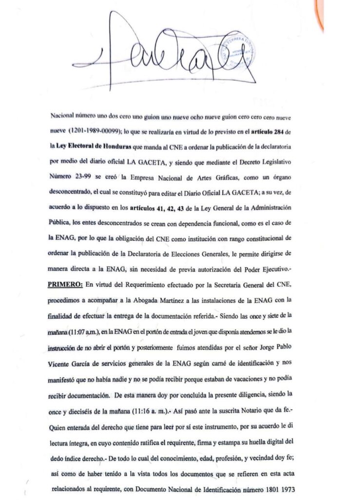 Tegucigalpa – El Consejo Nacional Electoral (CNE), informó que dejó constancia que presentó la declaratoria oficial de los comicios generales ante la Empresa Nacional de Artes Gráficas (ENAG) para que fuera publicado en el diario oficial La Gaceta.