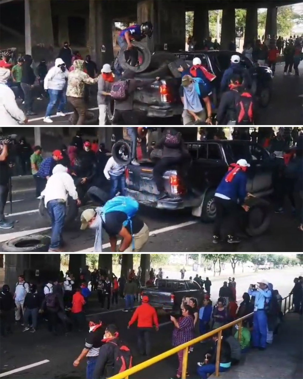 Para impedir el paso vehicular, un reducido número de protestantes quemó llantas sobre los dos carriles del bulevar Fuerzas Armadas y solo han estado permitiendo el paso de ambulancias. Hasta el mediodía de este lunes, esa vía de comunicación seguía tomado. VC