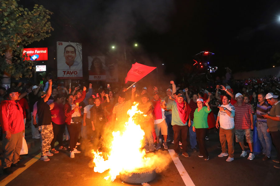 Durante un tiempo, los colectivos de Libre quemaron llantas en el bulevar FFAA como forma de presión para exigir transparencia en el cierre del escrutinio electoral. Elementos policiales y militares resguardan la zona para garantizar la seguridad de las instalaciones y del personal asignado en el CNE. AG