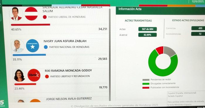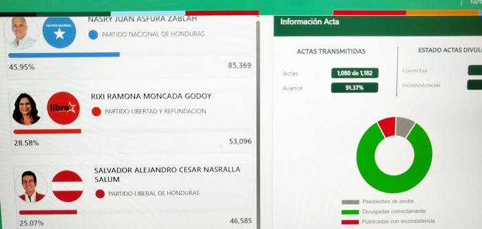 Asimismo, en el departamento de Olancho, Nasry Asfura fue el favorecido de la población con 85 mil 369 votos, Rixi Moncada con 53 mil 096 votos y Salvador Nasralla con 46 mil 585 votos.