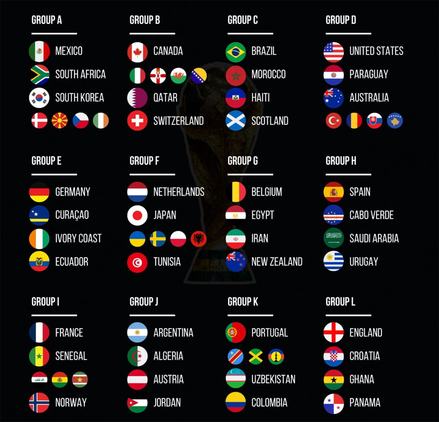 | Grupo A: México, Sudáfrica, República de Corea y ganador del ‘play off’ europeo D (República Checa/Irlanda/Dinamarca/Macedonia). Grupo B: Canadá, ganador del ‘play off’ europeo A (Gales/Bosnia/Italia/Irlanda), Catar y Suiza. Grupo C: Brasil, Marruecos, Haití y Escocia. Grupo D: Estados Unidos, Paraguay, Australia y gaandor del ‘play off’ europeo C (Eslovaquia/Kosovo/Turquía/Rumanía). Grupo E: Alemania, Curasao, Costa de Marfil y Ecuador. Grupo F: Países Bajos, Japón, ganador del ‘play off’ europeo B (Ucrania/Suecia/Polonia/Albania) y Túnez. Grupo G: Bélgica, Egipto, Irán y Nueva Zelanda. Grupo H: España, Cabo Verde, Arabia Saudí y Uruguay. Grupo I: Francia, Senegal, ganador del ‘play off’ 2 (Bolivia/Irak/Surinam) y Noruega. Grupo J: Argentina, Argelia, Austria y Jordania. Grupo K: Portugal, ganador del ‘play off’ 1 (Nueva Caledonia/Jamaica/RD Congo), Colombia y Uzbekistán. Grupo L: Inglaterra, Croacia, Ghana y Panamá. EFE |