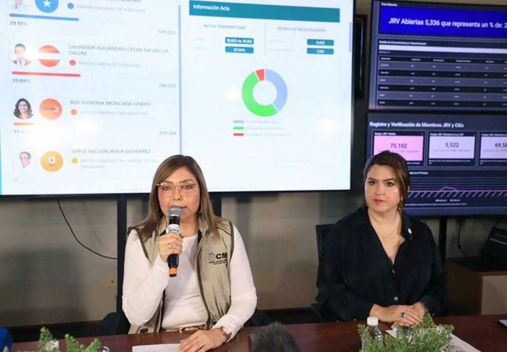 Tegucigalpa – Con la ausencia del consejero Marlon Ochoa, las demás integrantes del pleno del Consejo Nacional Electoral (CNE), Ana Paola Hall y Cossette López anunciaron un centro de divulgación público para seguir los resultados electorales en tiempo real, mientras la empresa ASD solventa el problema del sitio web destinado para ese tal fin.