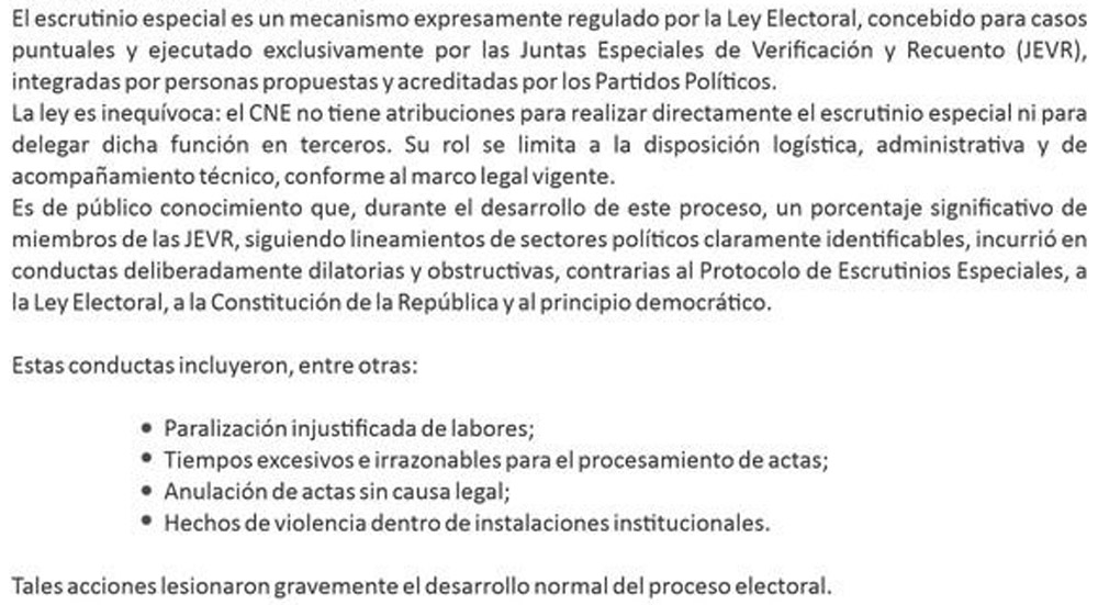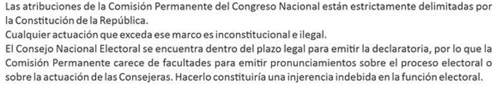 Sin embargo, ambas consejeras reafirmaron que el órgano electoral “no permitirá, bajo ninguna circunstancia que se fracture el orden constitucional ni que se desconozca la voluntad popular expresada en las urnas”.