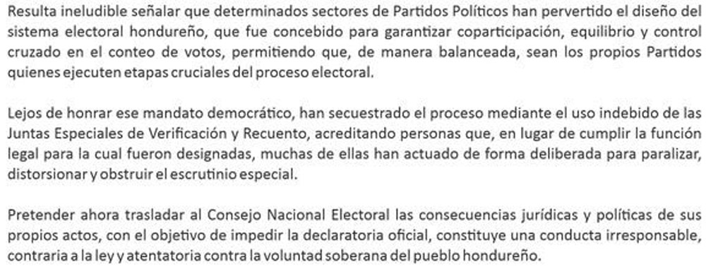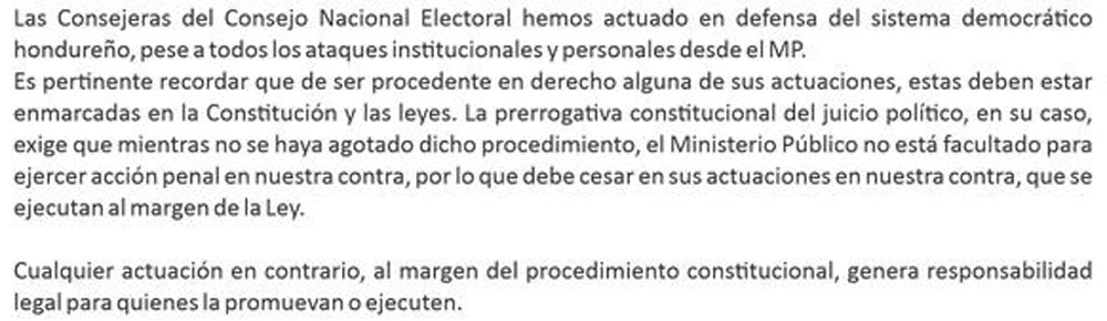 Finalmente, las consejeras Ana Paola Hall y Cossette López piden a los partidos políticos, misiones de observación nacionales e internacionales, y al pueblo hondureño, estar vigilantes a cualquier nuevo atentado contra el proceso electoral o para quienes lo dirigen. JS