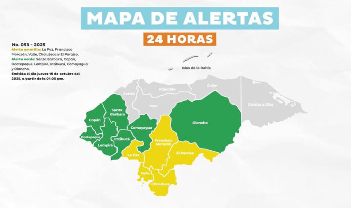 Asimismo, se amplía la Alerta Verde para los departamentos de Santa Bárbara, Copán, Ocotepeque, Lempira, Intibucá, Comayagua y Olancho.
