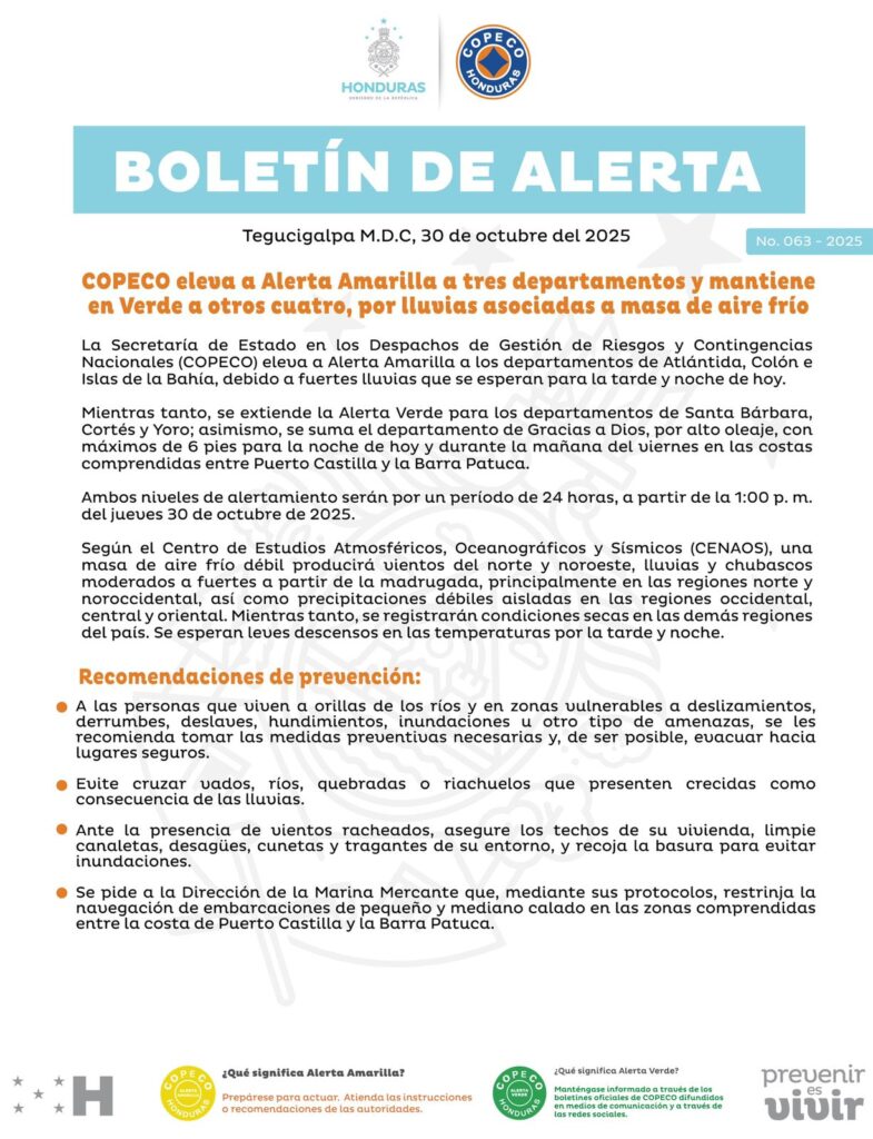 Los departamentos con alerta amarilla son: Atlántida, Colón e Islas de la Bahía.