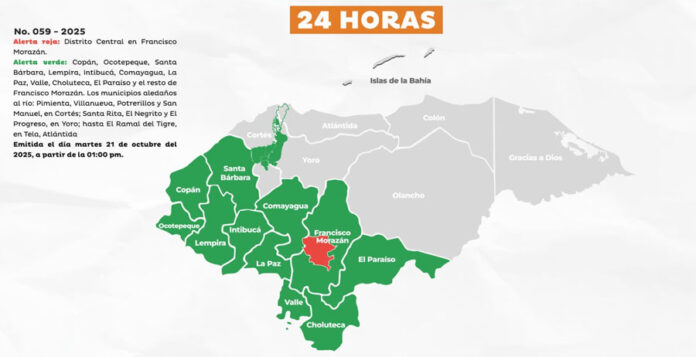 De igual manera mantiene la Alerta Verde en los departamentos de: Copán, Ocotepeque, Santa Bárbara, Lempira, Intibucá, Comayagua, La Paz, Valle, Choluteca, El Paraíso y el resto de Francisco Morazán. También se incluye a los municipios aledaños al río Ulúa.