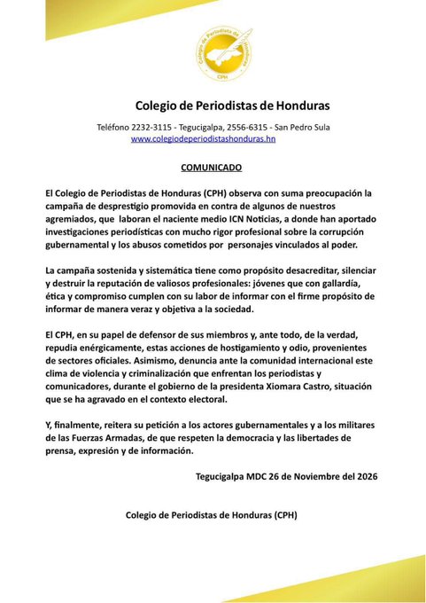 En ese sentido, indica el comunicado que se han hecho denuncias ante la comunidad internacional sobre el clima de hostigamiento y criminalización que enfrentan los periodistas en el país, especialmente en este periodo electoral. IR