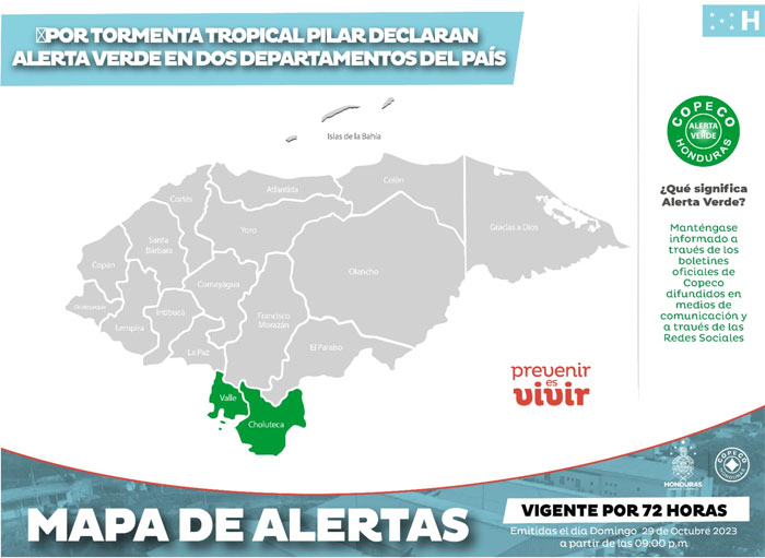 NacionalesDeclaran alerta verde para Choluteca y Valle por tormenta PilarPor: Proceso Digital29 de octubre de 2023FacebookTwitterWhatsAppEmailImpresión Tegucigalpa- Ante la amenaza de la tormenta tropical Pilar, se ha declarado alerta verde en Choluteca y Valle por 72 horas. Se pide a la población que habita en zonas vulnerables tomar todas las medidas de prevención. IR📢 Boletín de Alerta. 043- 2023Por tormentas tropical Pilar declaran alerta verde en dos departamentos del país 👇🏻 pic.twitter.com/r93bmM08Bm— Secretaría de Gestión de Riesgos y Contingencias (@CopecoHonduras1) October 30, 2023 Noticias recientes PolíticaPrestar atención a advertencias de organismos internacionales por creciente tensión electoral en Honduras, pide analista NacionalesPor segunda ocasión Casa Presidencial omite contestar a Sala Constitucional sobre estado de excepción, denuncia Nelson Castañeda EconomíaAnuncian inversión de L. 812 millones en modernización de hidroeléctrica Cañaveral InternacionalesNancy Pelosi, la lideresa que mueve los hilos del Partido Demócrata NacionalesColectivos de Libre se toman la Serna por despidos de empleados