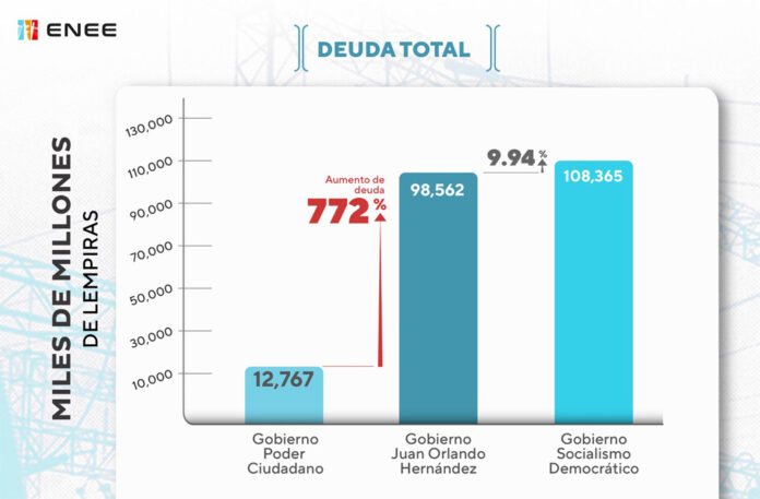 Tejada, que en los cuatro años de Castro fungió como gerente interino de la estatal de energía, mencionó que del 2010 al 2022 la deuda total de la ENEE creció 772 %, además no hubo inversión, no hubo subsidios substanciales y dejaron casi morir la empresa.