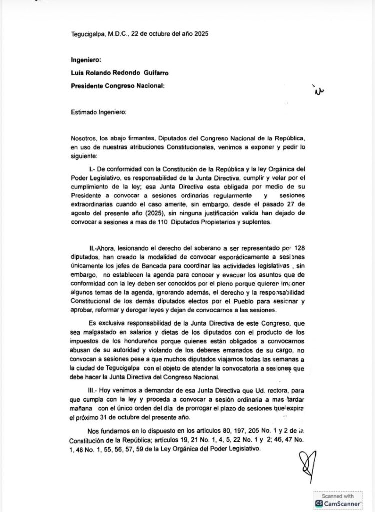 Tegucigalpa – Un grupo de diputados del Congreso Nacional presentó este martes una carta formal al presidente del Legislativo, Luis Rolando Redondo Guifarro, en la que denuncian una “parálisis legislativa injustificada” y exigen la inmediata convocatoria a sesiones ordinarias, suspendidas desde el pasado 27 de agosto.