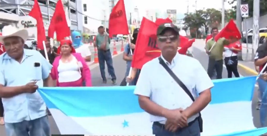 Tegucigalpa – Un grupo de dirigentes del Partido Libertad y Refundación (Libre) del municipio de Nueva Arcadia, departamento de Copán, realizan este miércoles una protesta frente a Casa Presidencial en la capital hondureña.