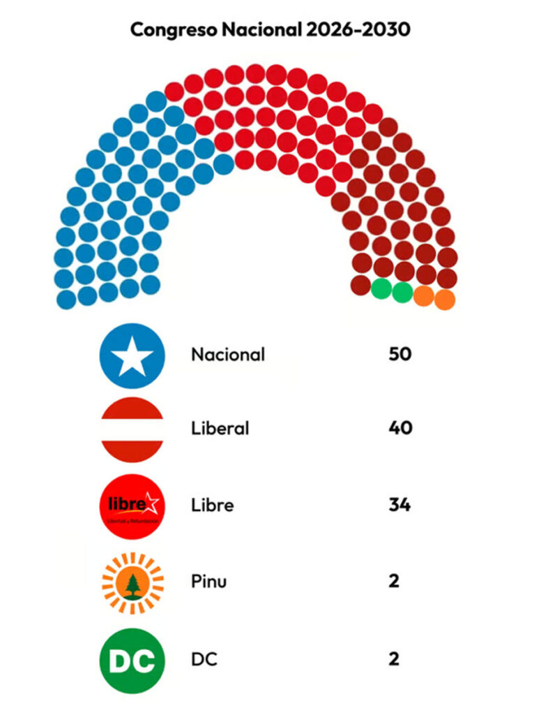La próxima composición del Congreso Nacional de manera preliminar sería: 50 diputados para el Partido Nacional, 40 al Partido Liberal, 34 a Libre, y dos para al Partido de Innovación y Unidad Social Demócrata (Pinu-SD y dos el Partido Democracia Cristiana (DC).