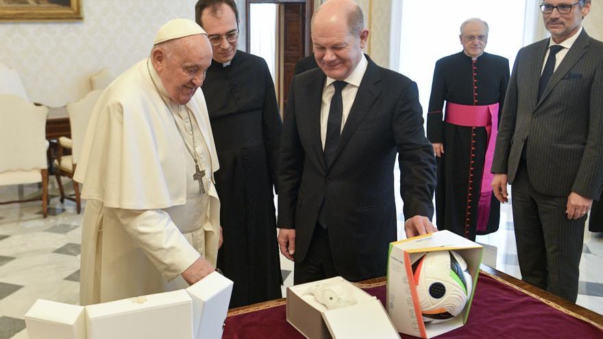 Ciudad del Vaticano.– El papa Francisco recibió este sábado al canciller alemán, Olaf Scholz, en una audiencia privada en el Vaticano en la que abordaron «los conflictos en Ucrania, Israel y Palestina» y durante la cual el mandatario le regaló al pontífice el balón oficial de la Eurocopa que se disputará en Alemania dentro de unos meses.