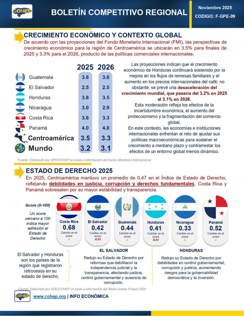 Respeto al Estado de derecho, el boletín del Cohep mostró que Centroamérica mantuvo un promedio de 0.47 en el Índice de Estado de Derecho, reflejando debilidades en justicia, corrupción y derechos fundamentales.