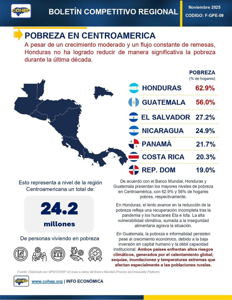 El boletín competitivo regional del Cohep muestra que un total de 24.2 millones de personas de Centroamérica viven en condiciones de pobreza.