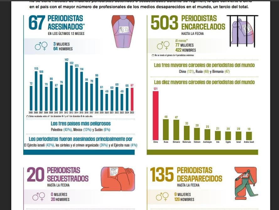 Más allá de los asesinatos, el informe documenta un aumento sostenido de la represión. A 1 de diciembre de 2025, 503 periodistas permanecían detenidos en 47 países. China continúa siendo la mayor cárcel de periodistas del mundo, con 121 profesionales encarcelados, cifra que asciende a 129 si se incluyen los ocho detenidos en Hong Kong. Rusia ocupa el segundo lugar, con 48 periodistas presos, 26 de ellos ucranianos, y supera a Birmania, que registra 47.