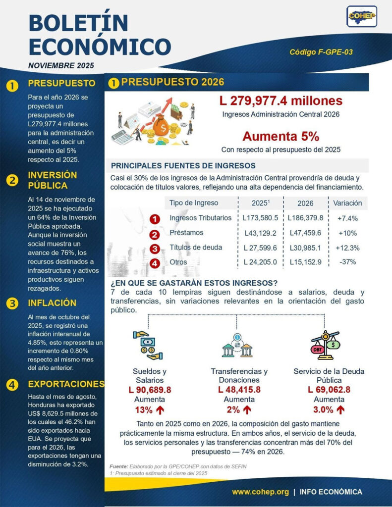 Este jueves, la organización que aglutina a la empresa privada de Honduras emitió el boletín económico correspondiente a noviembre para referirse al presupuesto de la Administración Central en 2026, la inversión pública y la inflación en octubre.