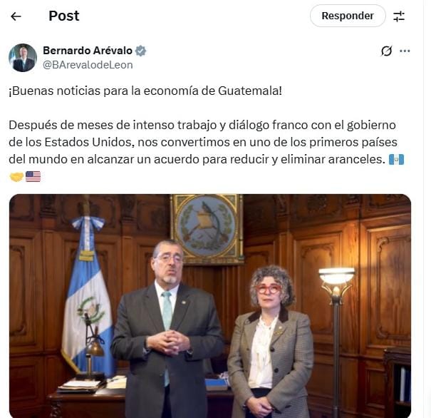 Mientras en Guatemala, su mandatario anunció que el acuerdo que calificó como «acuerdo histórico» se logró tras «intensas negociaciones», y que permitirá que «más del 70 % de los productos que Guatemala exporta hacia Estados Unidos quedarán con el arancel cero».