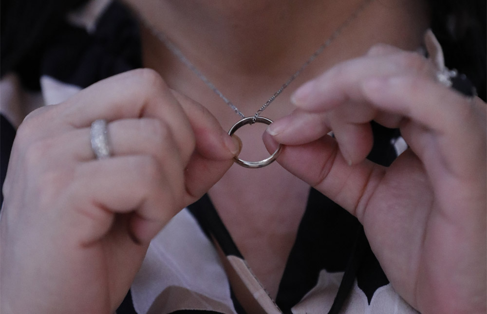 García mostró en su cuello el anillo de matrimonio de su esposo que porta desde que Hernández fue recluido en una cárcel de los ‘Cobras’, de la Policía Nacional, el día que fue capturado, el 15 de febrero de 2022.