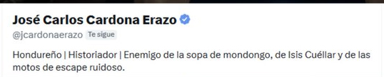 Tegucigalpa – El exministro de la Secretaría de Desarrollo Social (Sedesol), José Carlos Cardona, cambió la descripción de su perfil de X y ahora se declaró enemigo de la diputada Isis Cuéllar y de las motos de escape ruidoso.