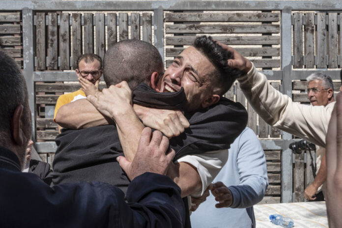 Llegada de rehenes palestinos a Ramala, Palestina, este lunes. La mayoría de las familias que aguardaron este lunes la llegada de sus seres queridos en Ramala, capital de Cisjordania ocupada, apenas supieron un día antes que iban a ser liberados. Poco después de que Hamás entregara esta mañana a 20 rehenes israelíes, cerca de 90 palestinos recobraron aquí su libertad entre cánticos y vítores. EFE/Patricia Martínez