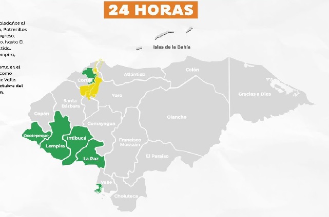 Mientras que los departamentos de Ocotepeque, La Paz, Lempira, Intibucá; y los municipios de La Lima y Choloma en Cortés, y Alianza en Valle se mantienen con Alerta Verde.