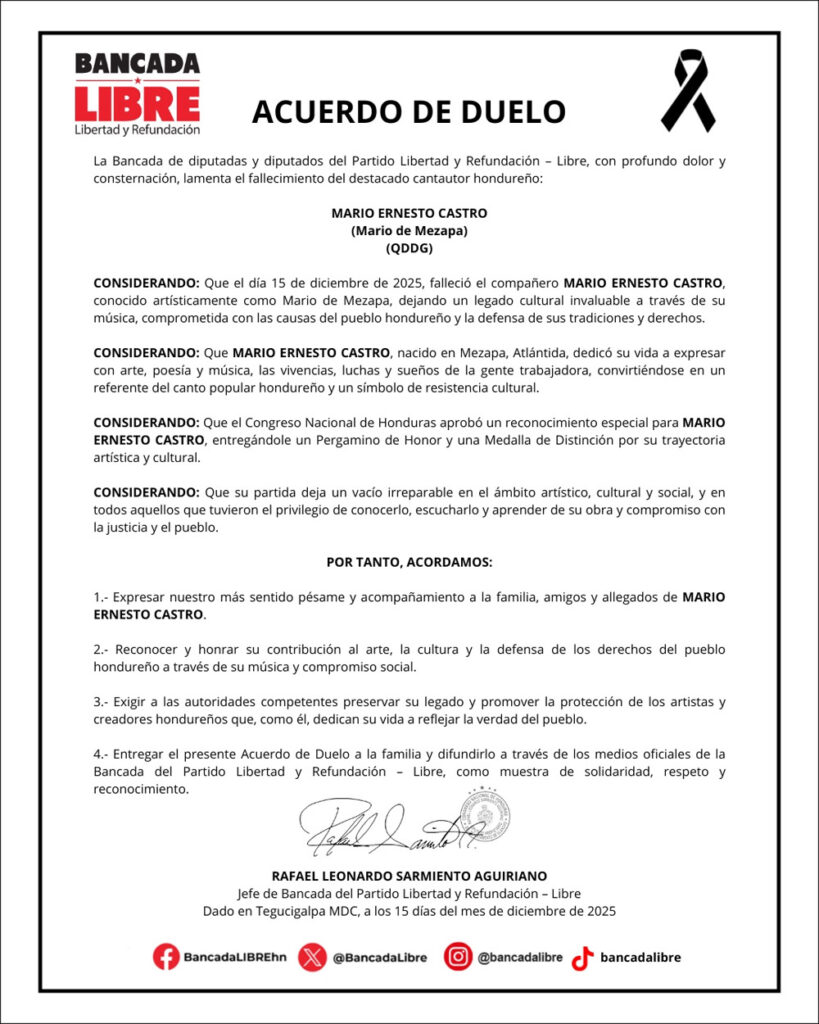 Tegucigalpa – Este lunes se confirmó el deceso del cantautor hondureño Mario Ernesto Castro, conocido popularmente como “Mario Mezapa”. Fue fundador y dirigente de la Central Nacional de Trabajadores del Campo (CNTC), en Puerto Cortés.