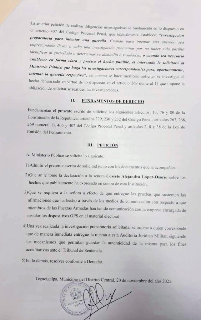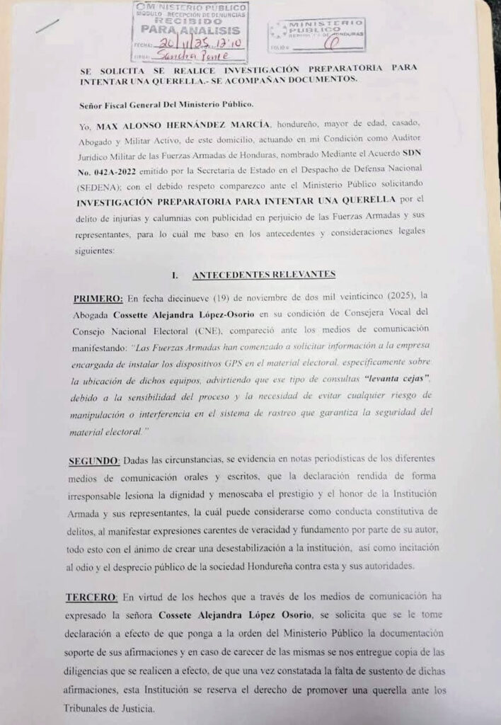 Tegucigalpa – Las Fuerzas Armadas presentaron este jueves ante el Ministerio Público una solicitud preparatoria con el propósito de interponer una querella contra la integrante del pleno del Consejo Nacional Electoral (CNE), Cossette López.