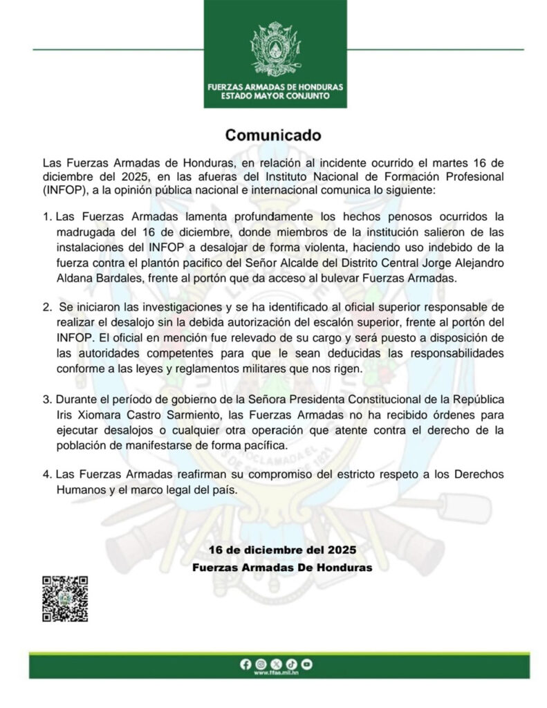 El cuerpo castrense lamentó los hechos ocurridos la madrugada de este martes, donde miembros del cuerpo castrense desalojaron en forma violenta a los manifestantes en los predios del Infop mediante el uso desmedido de la fuerza en el plantón del alcalde Jorge Aldana frente al portón que da acceso al bulevar Fuerzas Armadas.