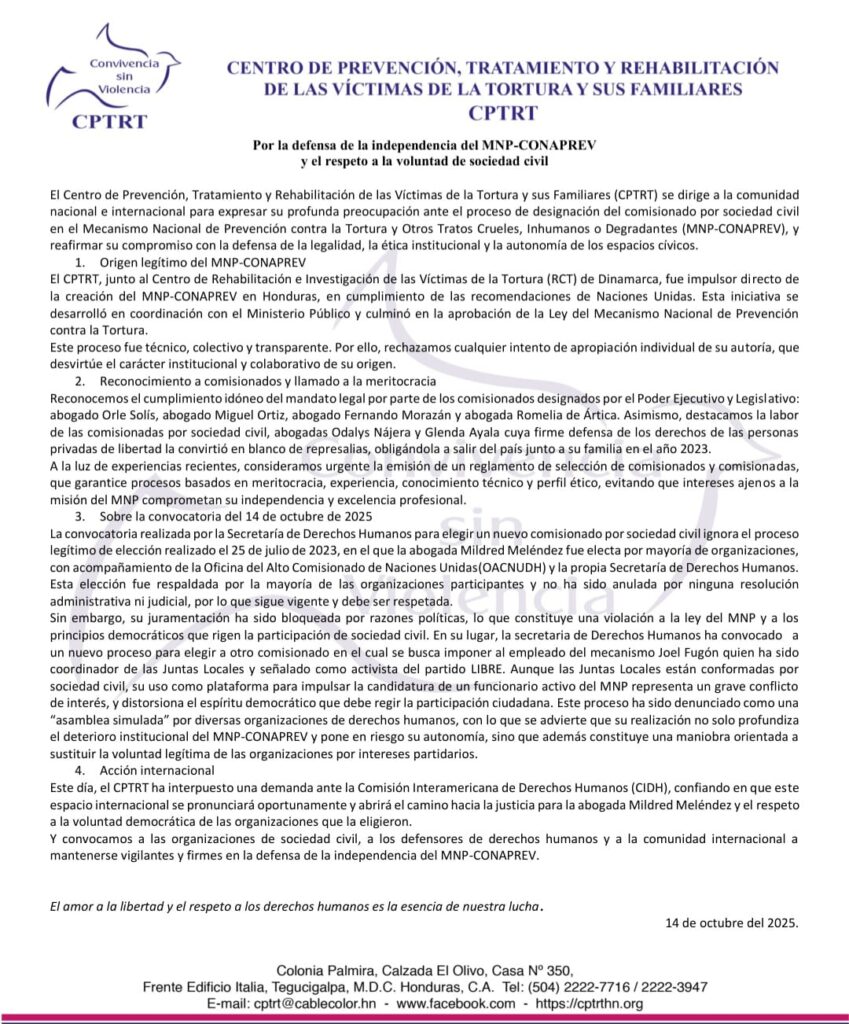 Tegucigalpa – El Centro de Prevención, Tratamiento y Rehabilitación de las Víctimas de la Tortura y sus Familiares (CPTRT) denunció que el gobierno, a través de la Secretaría de Derechos Humanos, realizó este martes una convocatoria para elegir un nuevo comisionado por la sociedad civil ante el Mecanismo Nacional de Prevención contra la Tortura y Otros Tratos Crueles, Inhumanos o Degradantes (MNP-CONAPREV), ignorando la elección de Mildred Meléndez en 2023.